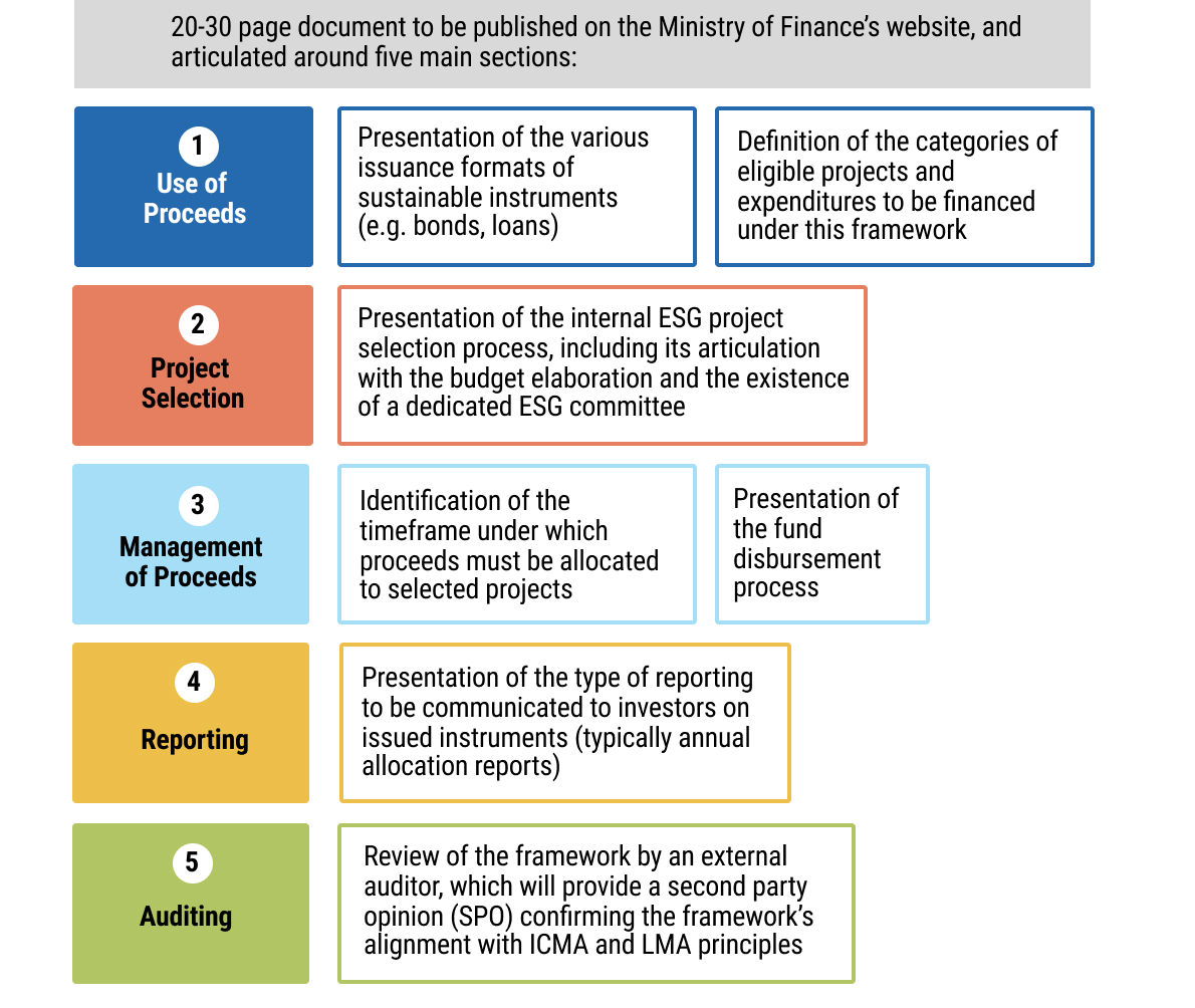 - chap5_li_24Preparation of a dedicated UoP Finance Framework for health. If the ICMA or LMA guidelines are being followed, the national framework will be mandatory for any borrower that wants to issue a UoP debt instrument on the international markets. The Framework serves as the reference for all future UoP issuances. It aims at (i) presenting the country’s national social and/or health priorities, (ii) defining clear eligibility criteria to select expenditures and projects financed by UoP instruments (e.g. health-related spending), and (iii) presenting the country’s governance structure in charge of selecting eligible expenditures and managing reporting. Such Frameworks need to be reviewed by an external third party, which will provide a second party opinion (SPO) confirming the document’s alignment with international standards. The Case Study below details the content and format of a UoP Finance Framework.