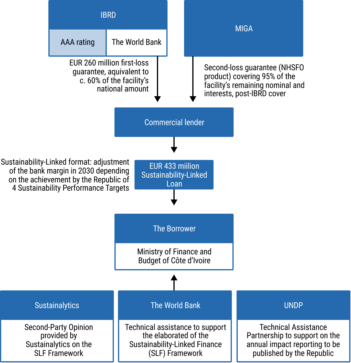 41chap5_p_41The SLL issued based on this Framework has benefited from strong support from the World Bank Group: it was the first-ever combination of two different World Bank guarantee products: (i) a Policy-Based Guarantee by the International Bank for Reconstruction and Development (IBRD), and (ii) a Non-Honouring of Sovereign Financial Obligations by the Multilateral Investment Guarantee Agency (MIGA). The graph below highlights the highly innovative structure. chap5_img_5 |