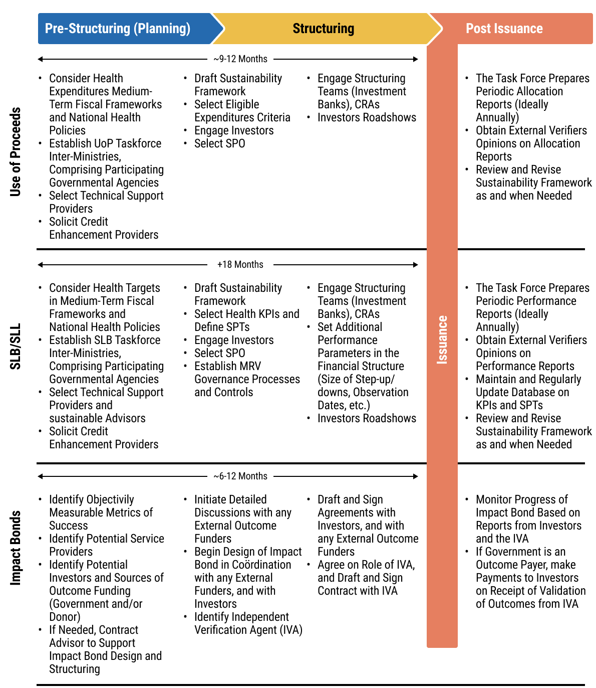 152chap5_p_152The three instruments outlined in this chapter each have their own specific requirements for designing, structuring and implementation, with particular input needed from each key stakeholder. There is also a difference in the expected timeframe before issuance, ranging from 6 to 12 months for an impact bond to over 18 months for an SLB/SLL.