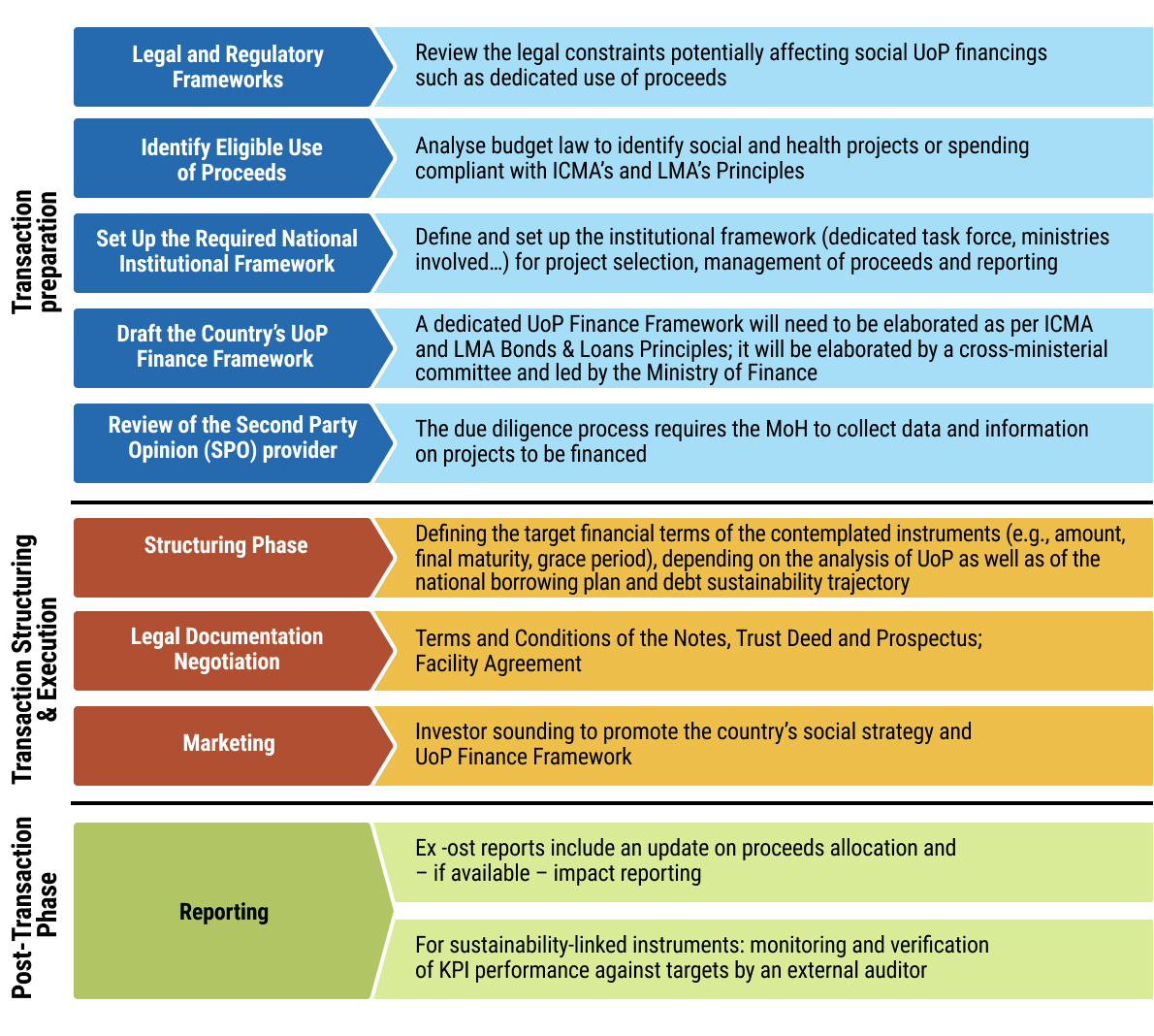 - chap5_li_24Preparation of a dedicated UoP Finance Framework for health. If the ICMA or LMA guidelines are being followed, the national framework will be mandatory for any borrower that wants to issue a UoP debt instrument on the international markets. The Framework serves as the reference for all future UoP issuances. It aims at (i) presenting the country’s national social and/or health priorities, (ii) defining clear eligibility criteria to select expenditures and projects financed by UoP instruments (e.g. health-related spending), and (iii) presenting the country’s governance structure in charge of selecting eligible expenditures and managing reporting. Such Frameworks need to be reviewed by an external third party, which will provide a second party opinion (SPO) confirming the document’s alignment with international standards. The Case Study below details the content and format of a UoP Finance Framework.