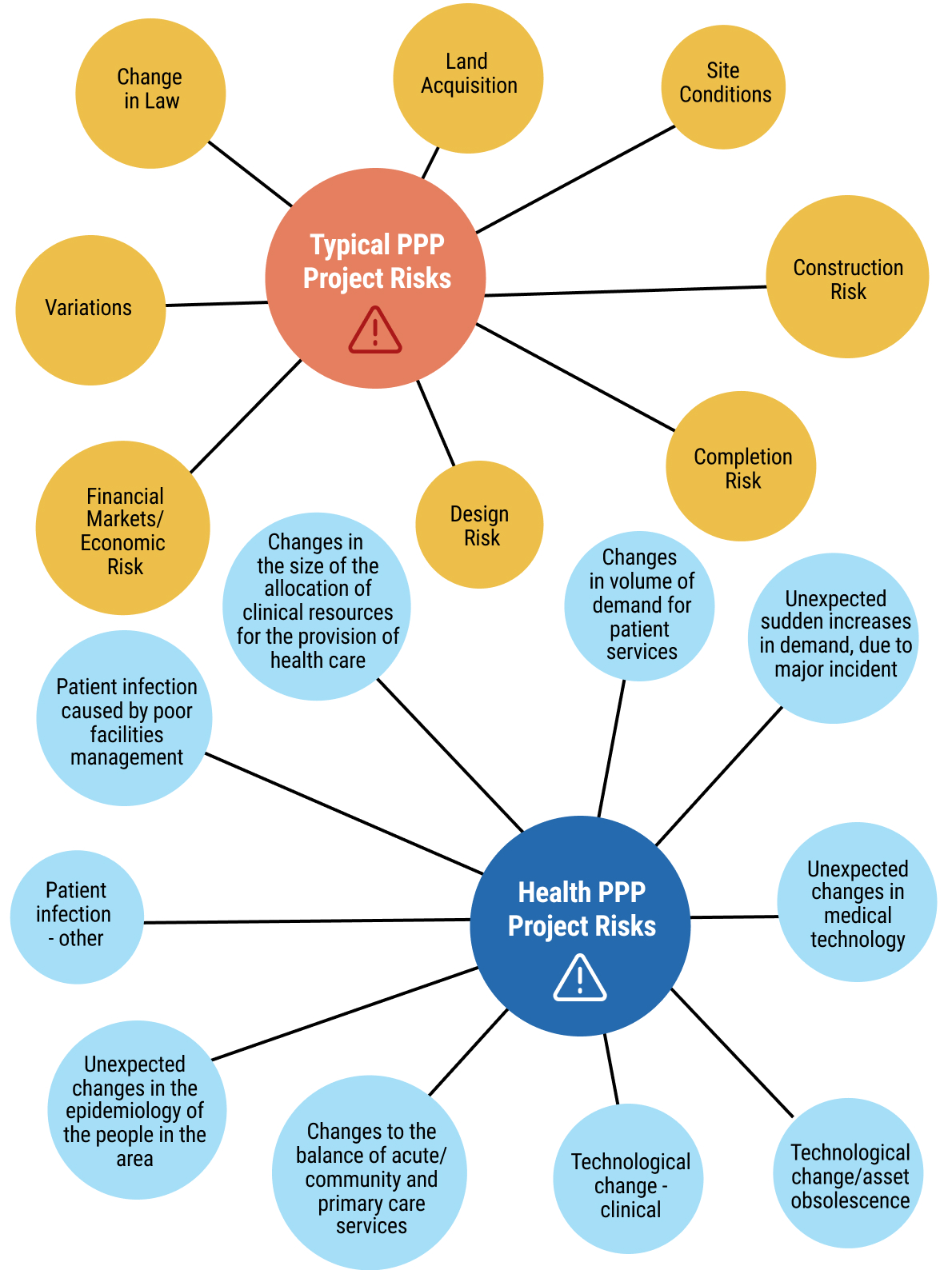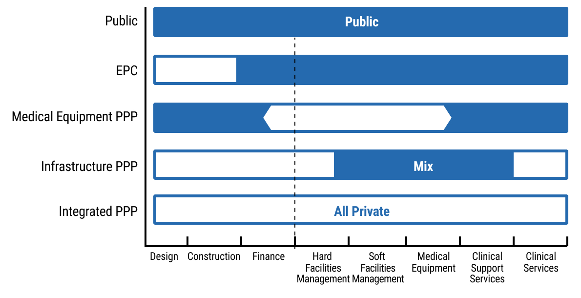 41chap7_p_41Health projects can be procured in several ways, ranging from full public delivery to arrangements where private partners are responsible for ongoing service provision. This chapter focuses on PPPs where the private partner contributes private finance and delivers the project. The chapter does not include engineering, procurement and construction (EPC) projects where the private provider does not provide an ongoing service after the completion of the construction phase.