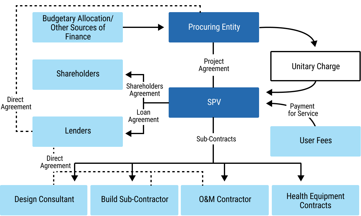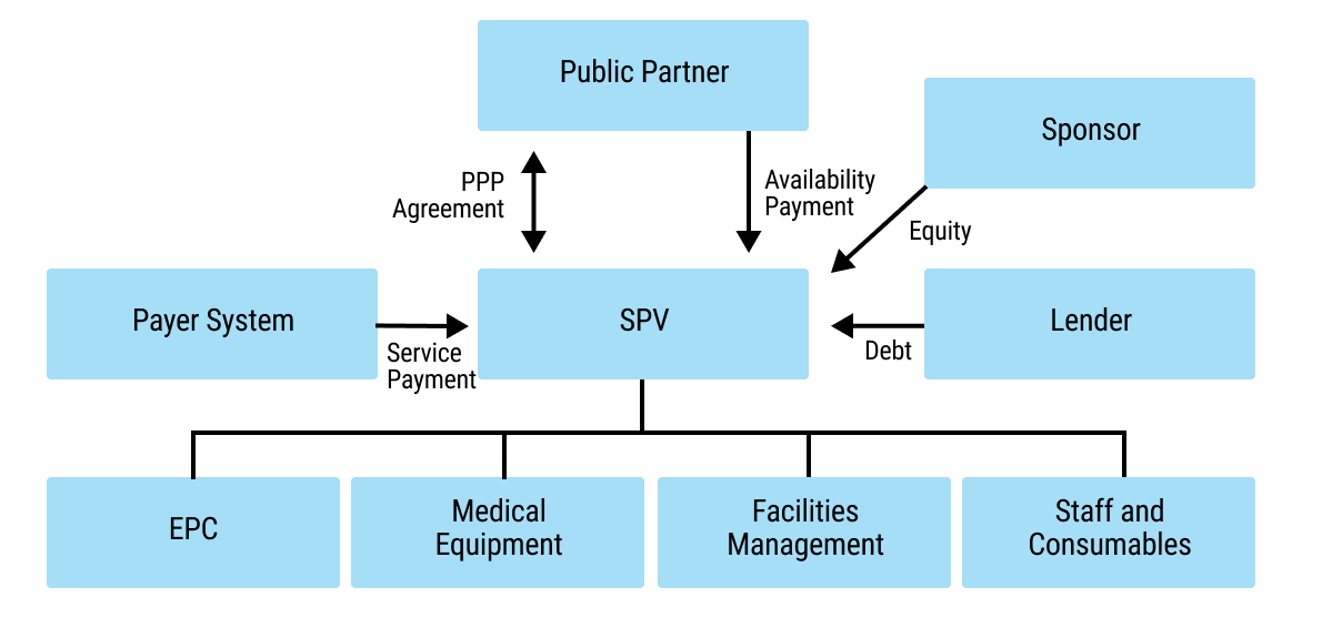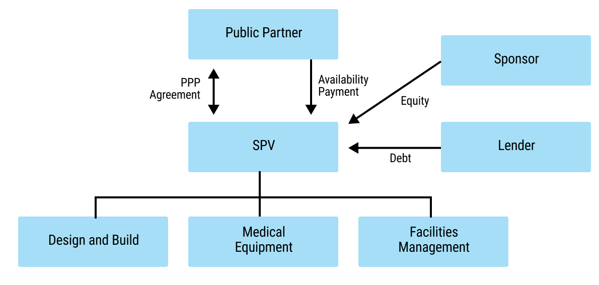 45chap7_p_45The diagram below presents a simple organisation chart showing how the parties in an infrastructure PPP are interrelated. The private partner is shown as an SPV, which enters into the PPP agreement with the procuring entity (shown as the Public Partner) and receives payment from the public partner in the form of an availability payment (a payment made once the asset is available for use per the contract). The funding comes primarily from the sponsor (or investor) as equity and from the lender as debt. The SPV then enters into subcontract arrangements for the design and build of the facility, for providing and installing medical equipment, and for undertaking facilities management.