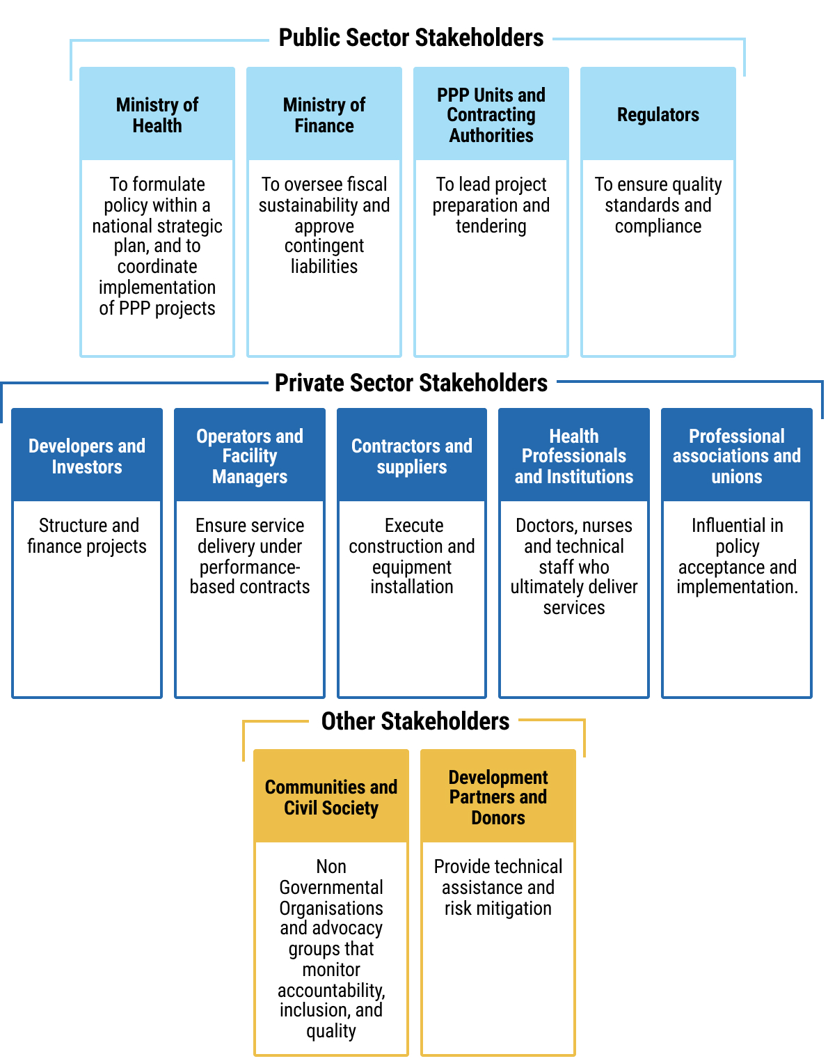 - chap7_li_113Stakeholder engagement. Provisions in the PPP contract should outline communication and engagement processes between the public partner, private partner, healthcare professionals and patient representatives to foster trust and proactively manage issues.