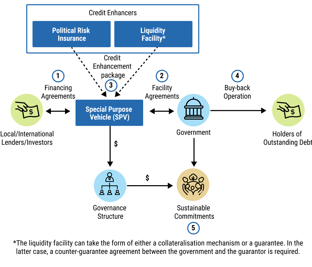 15chap8_p_15A common practice in debt conversions has been to establish an SPV to issue bonds to investors or enter into a loan agreement with lenders. The SPV will then on-lend the proceeds through a new loan agreement with the government. This new lending arrangement may be credit-enhanced by a PRI that covers the loan principal amount and will often be combined with a liquidity guarantee, ensuring that interest payments will still be made to investors prior to the policy paying out.